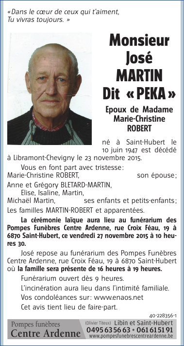 Décédé à Libramont (6800) le lundi 23 novembre 2015 à l'âge de 68 ans