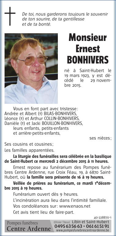 Décédé à Saint-Hubert (6870) le dimanche 29 novembre 2015 à l'âge de 92 ans