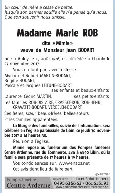 Madame Marie (dite Mimie) ROB veuve de Monsieur Jean BODART