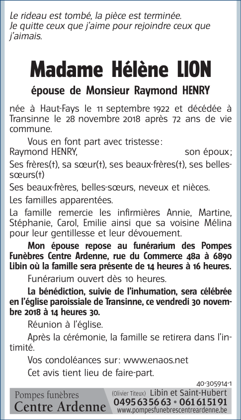 Décédée à Transinne (6890) le mercredi 28 novembre 2018 à l'âge de 96 ans