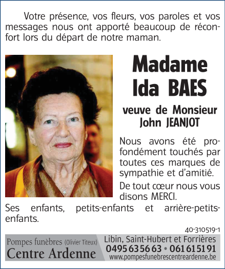 Madame Ida BAES veuve de Monsieur John JEANJOT