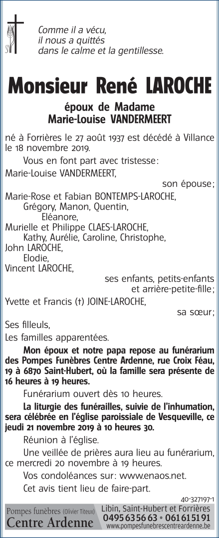 Décédé à Villance (6890) le lundi 18 novembre 2019 à l'âge de 82 ans