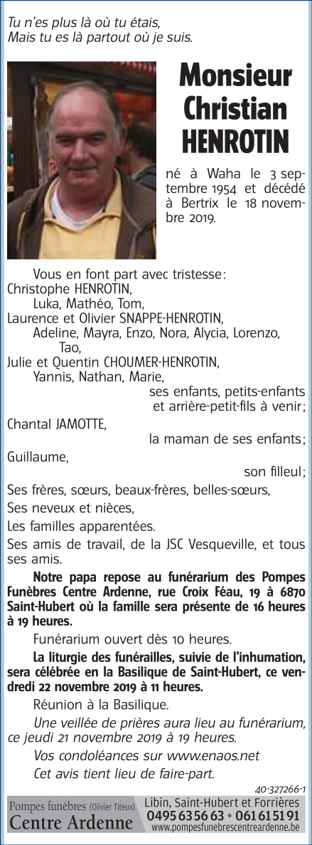 Décédé à Bertrix (6880) le lundi 18 novembre 2019 à l'âge de 65 ans