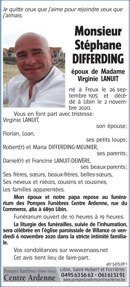 Décédé à Libin (6890) le lundi 2 novembre 2020 à l'âge de 45 ans