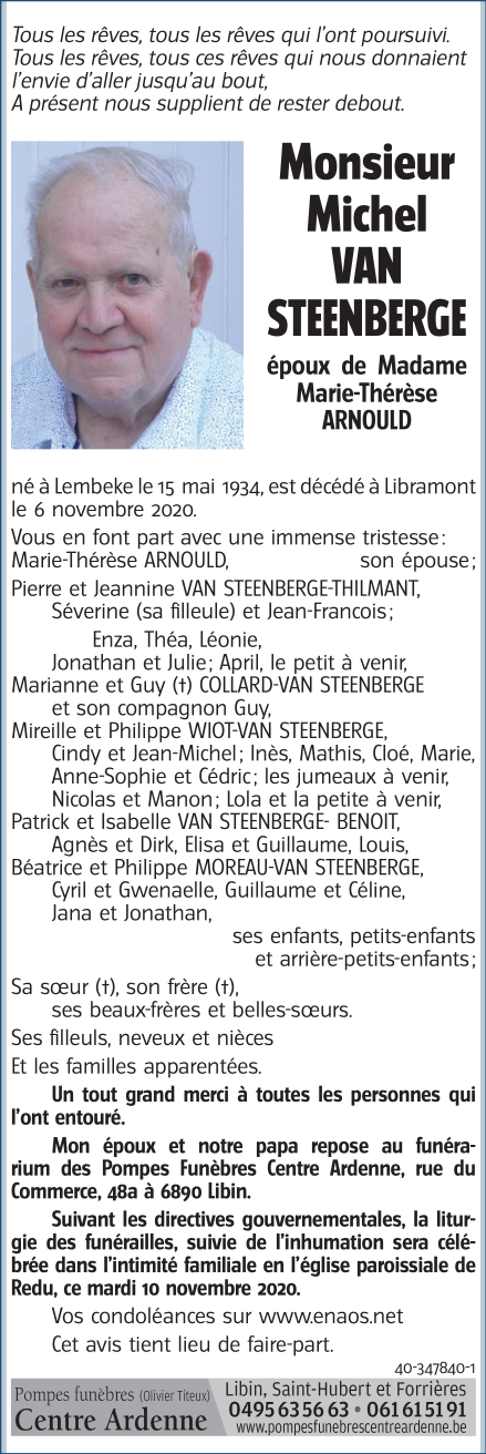 Décédé à Libramont (6800) le vendredi 6 novembre 2020 à l'âge de 86 ans