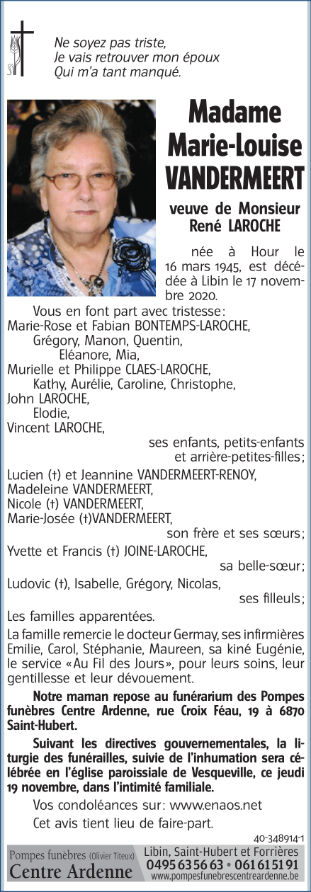 Madame Marie-Louise VANDERMEERT, veuve de Monsieur René LAROCHE