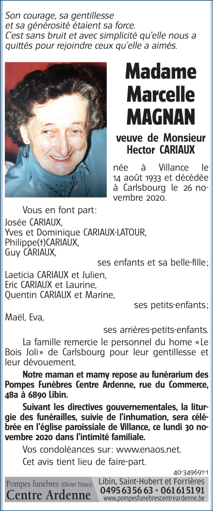 Décédé à Carlsbourg (6850) le jeudi 26 novembre 2020 à l'âge de 87 ans
