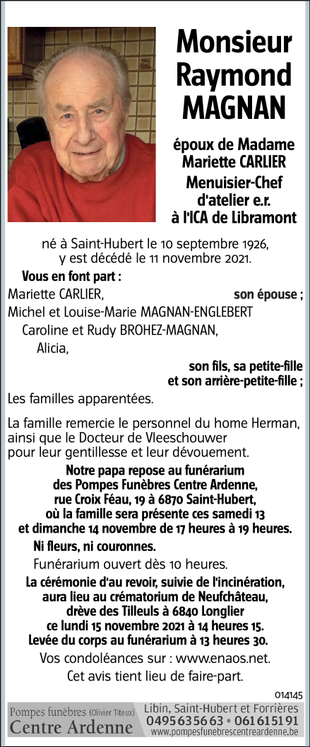 Décédé à Saint-Hubert (6870) le jeudi 11 novembre 2021 à l'âge de 95 ans