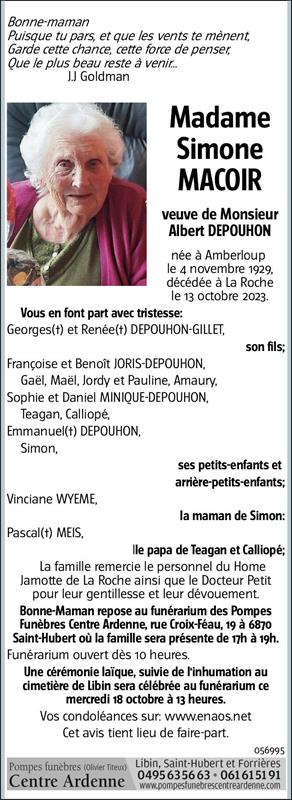 Décédée à La Roche-en-Ardenne (6980) le vendredi 13 octobre 2023 à l'âge de 93 ans