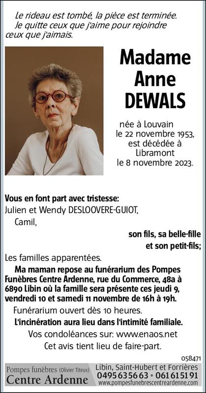 Décédée à Libramont-Chevigny (6800) le mercredi 8 novembre 2023 à l'âge de 69 ans