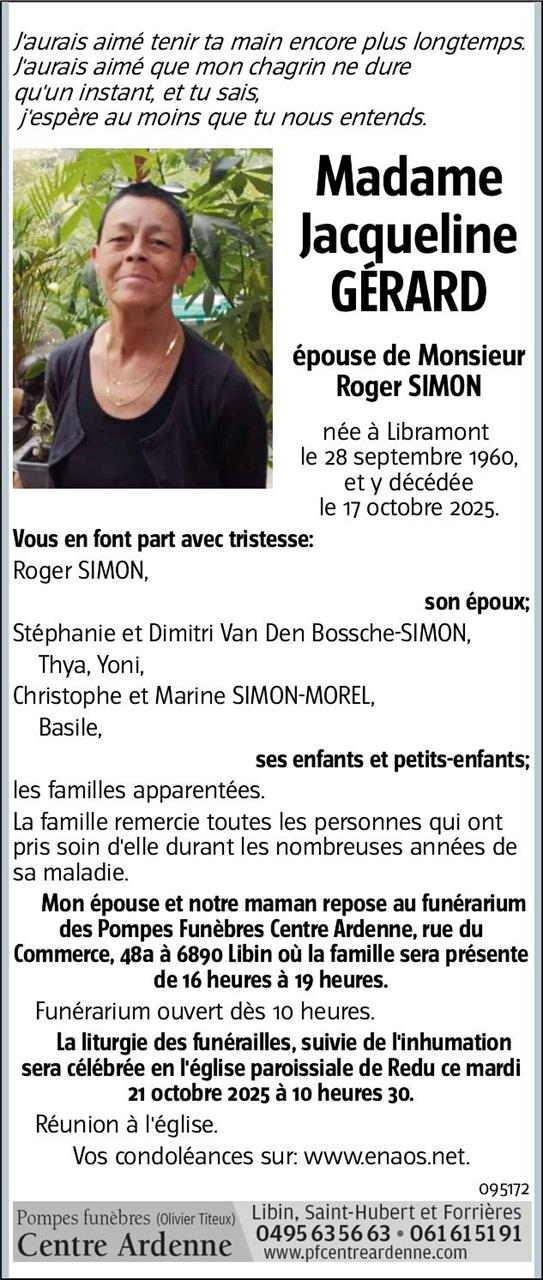 Décédée à Libramont-Chevigny (6800) le vendredi 17 octobre 2025 à l'âge de 65 ans