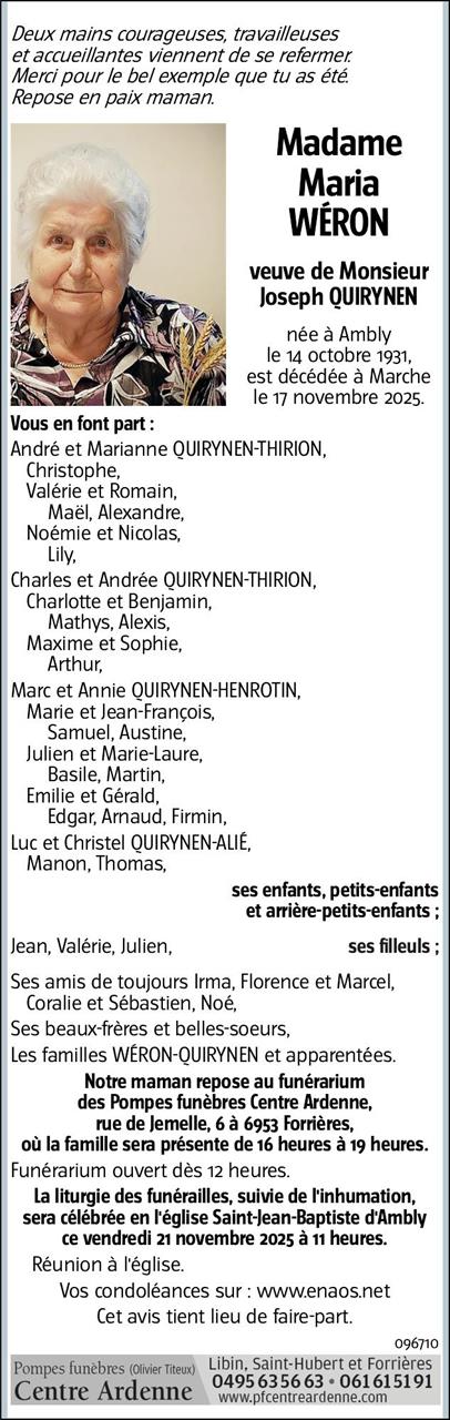 Décédée à Marche-en-Famenne (6900) le lundi 17 novembre 2025 à l'âge de 94 ans