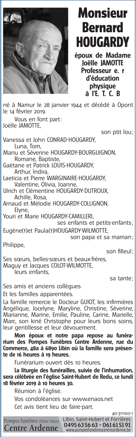 Décédé à Opont (6852) le jeudi 14 février 2019 à l'âge de 75 ans