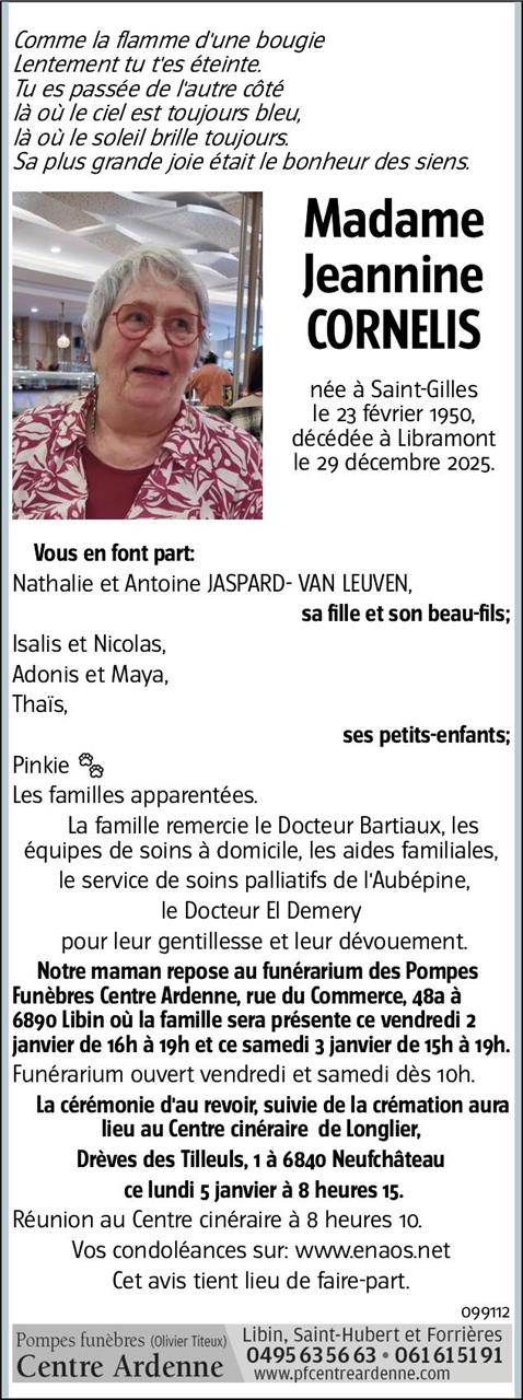 Décédée à Libramont-Chevigny (6800) le lundi 29 décembre 2025 à l'âge de 75 ans