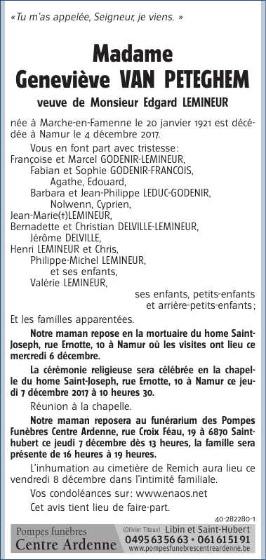 Madame Geneviève VAN PETEGHEM veuve de Monsieur Edgard LEMINEUR