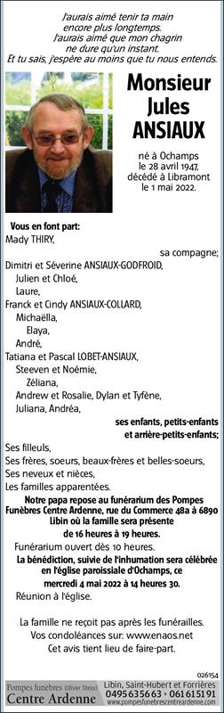 Décédé à Libramont-Chevigny (6800) le dimanche 1 mai 2022 à l'âge de 75 ans