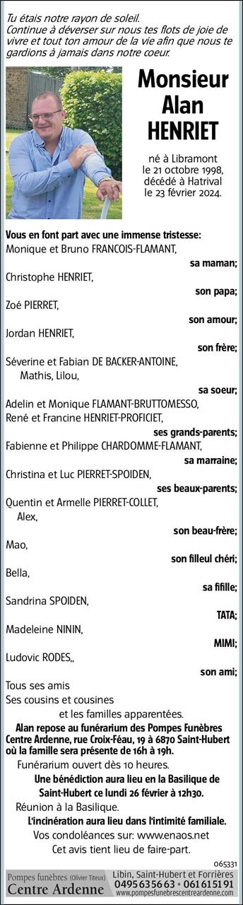 Décédé à Hatrival (6870) le vendredi 23 février 2024 à l'âge de 25 ans