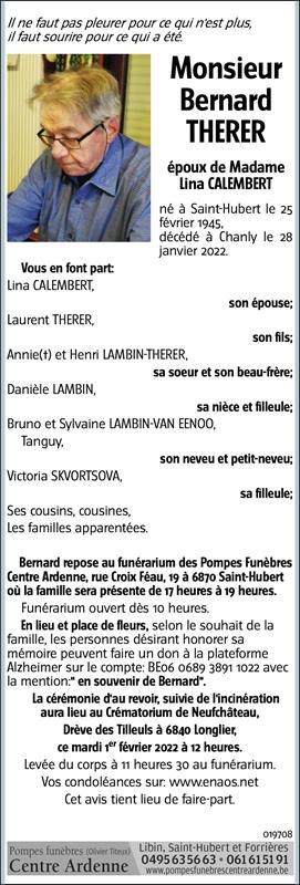Décédé à Chanly (6921) le vendredi 28 janvier 2022 à l'âge de 76 ans