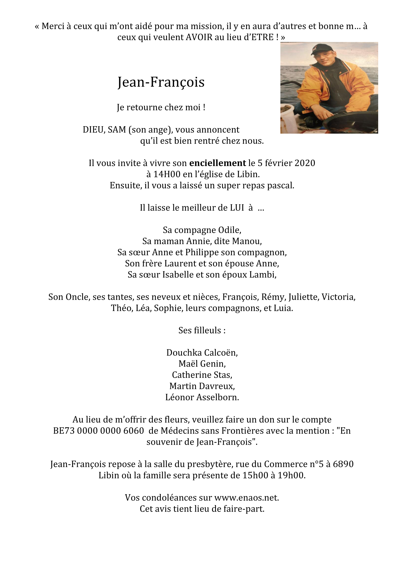 Décédé à Libin (6890) le samedi 1 février 2020 à l'âge de 52 ans