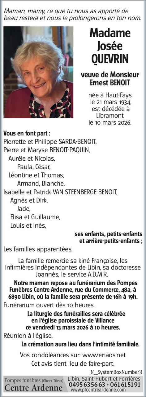 Décédée à Libramont-Chevigny (6800) le mardi 10 mars 2026 à l'âge de 91 ans