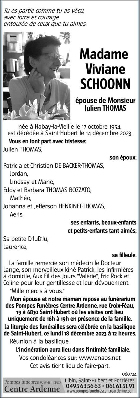 Décédée à Saint-Hubert (6870) le jeudi 14 décembre 2023 à l'âge de 69 ans