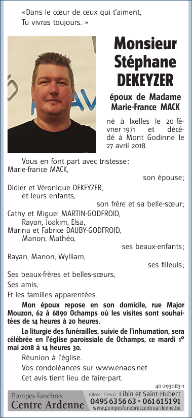 Décédé à Yvoir (5530) le vendredi 27 avril 2018 à l'âge de 47 ans