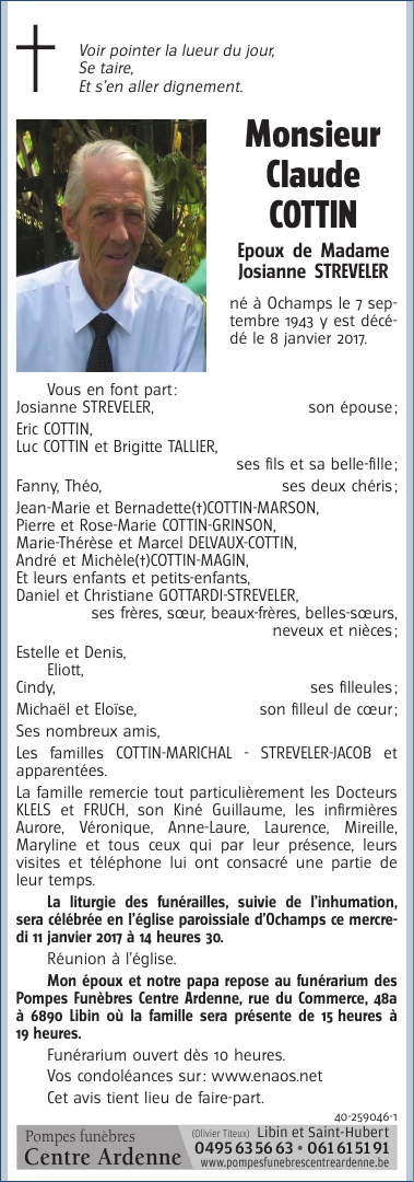Décédé à Ochamps (6890) le dimanche 8 janvier 2017 à l'âge de 73 ans