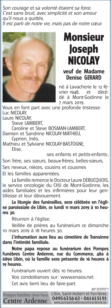 Décédé à Yvoir (5530) le jeudi 7 mars 2019 à l'âge de 71 ans