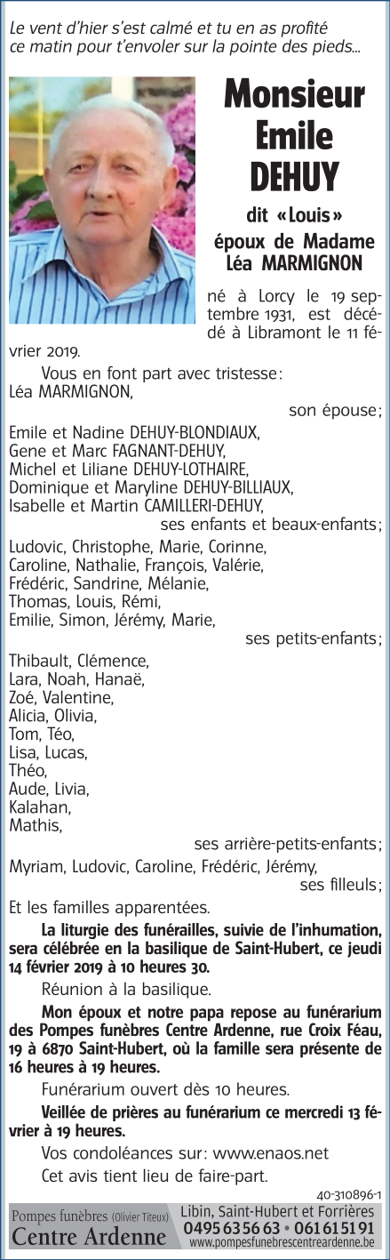 Monsieur Emile DEHUY dit "Louis" époux de Madame Léa MARMIGNON
