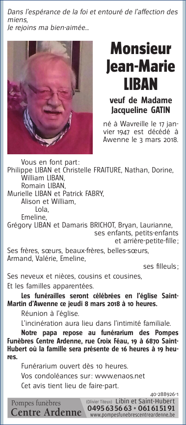 Monsieur Jean-Marie LIBAN Veuf de Madame Jacqueline GATIN