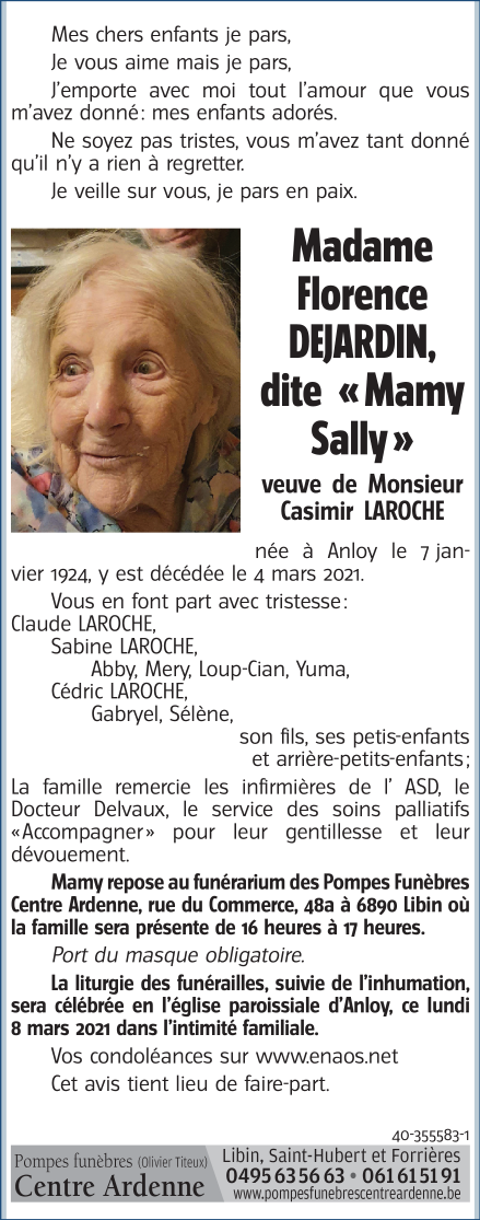 Décédée à Anloy (6890) le jeudi 4 mars 2021 à l'âge de 97 ans