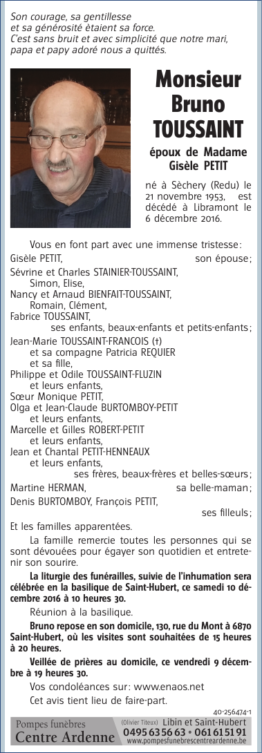 Décédé à Libramont (6800) le mardi 6 décembre 2016 à l'âge de 63 ans