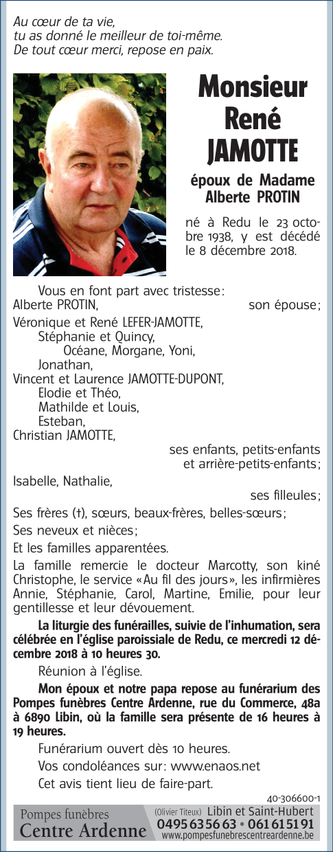 Monsieur René JAMOTTE époux de Madame Alberte PROTIN