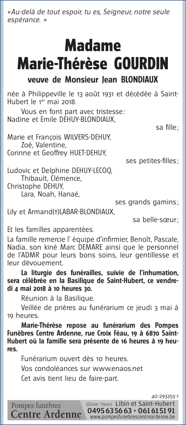 Décédée à Saint-Hubert (6870) le mardi 1 mai 2018 à l'âge de 86 ans