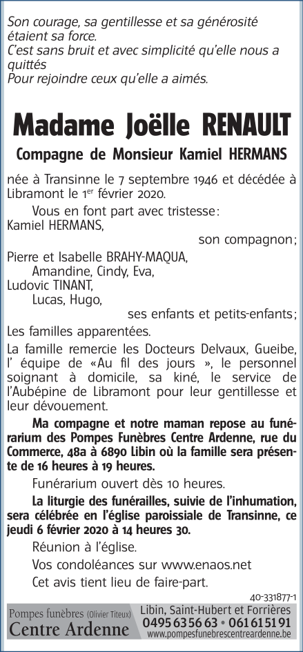 Décédée à Libramont-Chevigny (6800) le samedi 1 février 2020 à l'âge de 73 ans