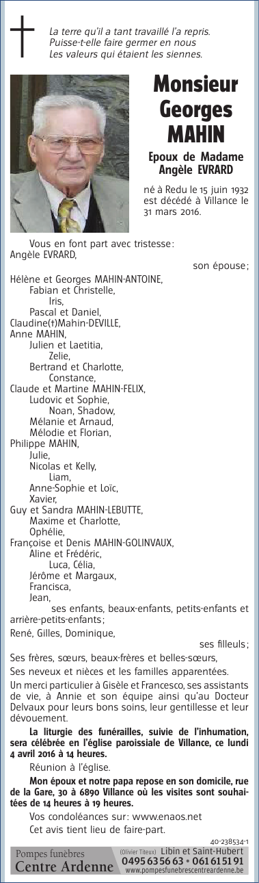 Décédé à Villance (6890) le jeudi 31 mars 2016 à l'âge de 83 ans