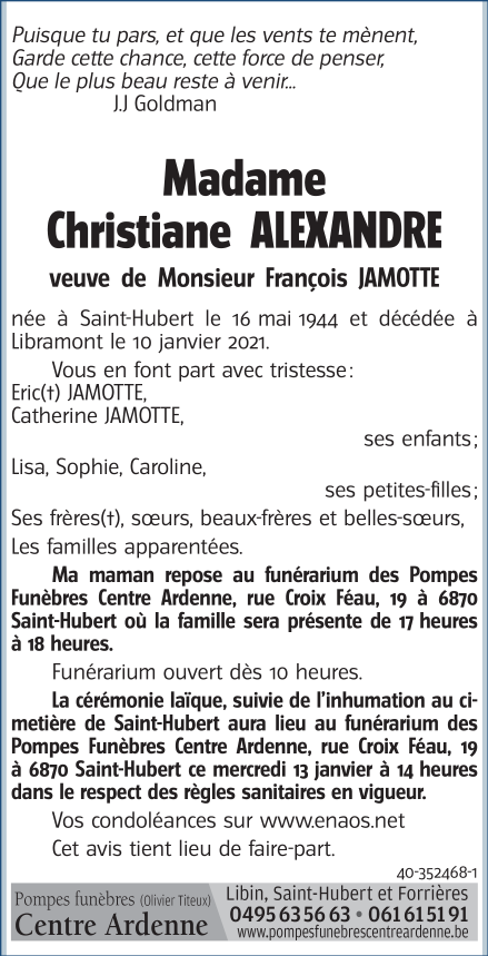 Décédée à Libramont-Chevigny (6800) le dimanche 10 janvier 2021 à l'âge de 76 ans