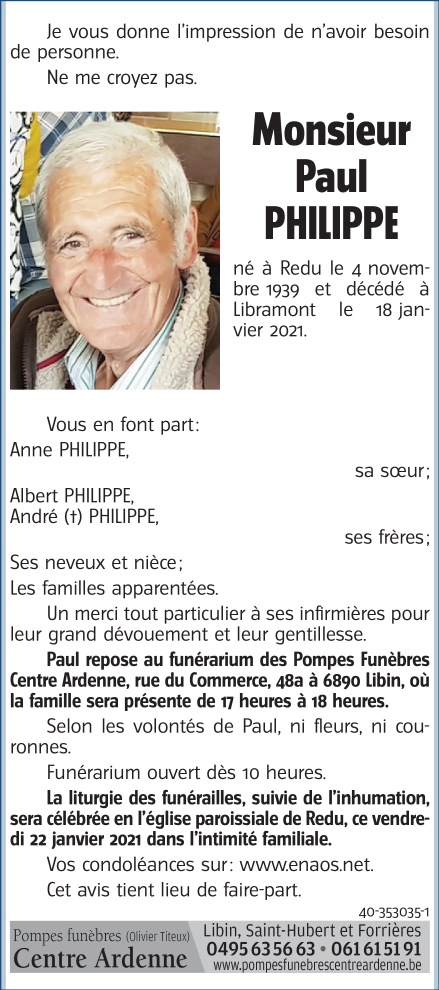 Décédé à Libramont (6800) le lundi 18 janvier 2021 à l'âge de 81 ans