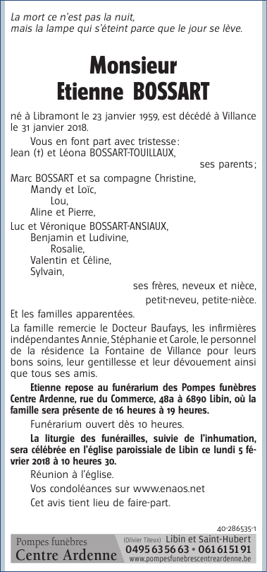 Décédé à Villance (6890) le mercredi 31 janvier 2018 à l'âge de 59 ans