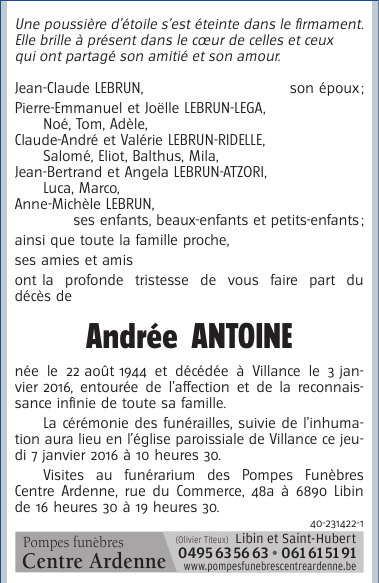 Décédée à Villance (6890) le dimanche 3 janvier 2016 à l'âge de 71 ans
