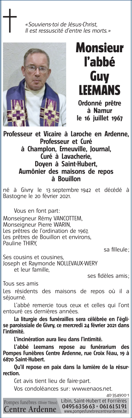 Décédé à Bastogne (6600) le samedi 20 février 2021 à l'âge de 78 ans