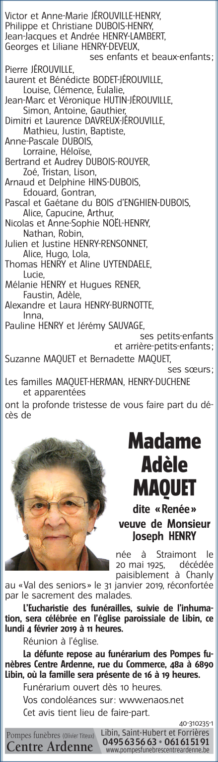 Madame Adèle MAQUET dite "Renée" Veuve de Monsieur Joseph HENRY