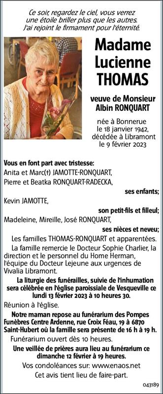 Décédée à Libramont-Chevigny (6800) le jeudi 9 février 2023 à l'âge de 81 ans