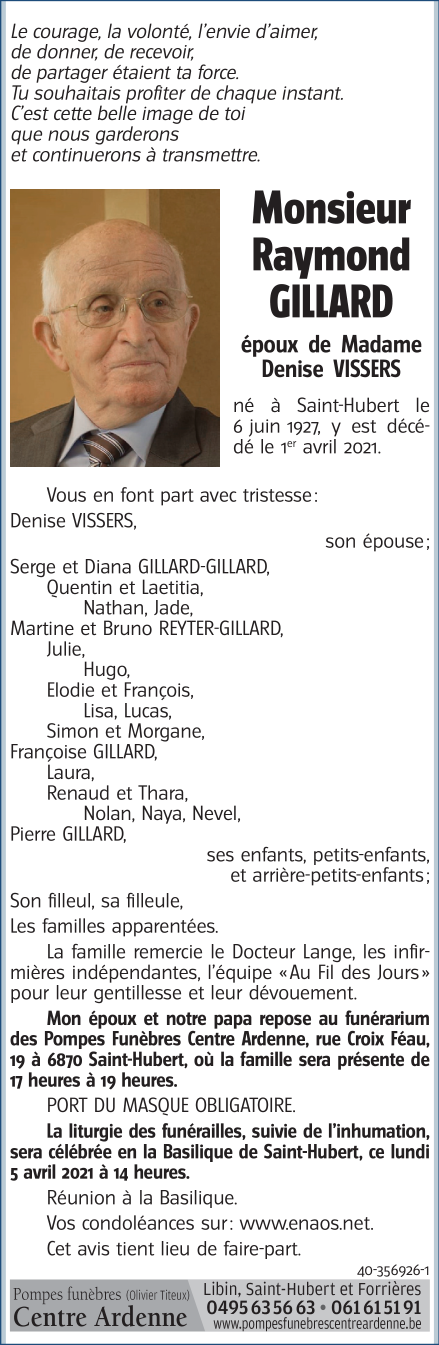 Décédé à Saint-Hubert (6870) le jeudi 1 avril 2021 à l'âge de 93 ans