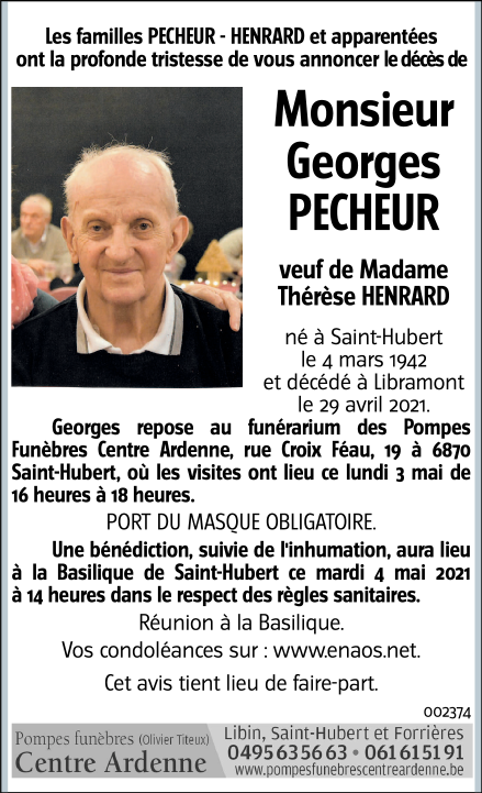 Décédé à Libramont (6800) le jeudi 29 avril 2021 à l'âge de 79 ans