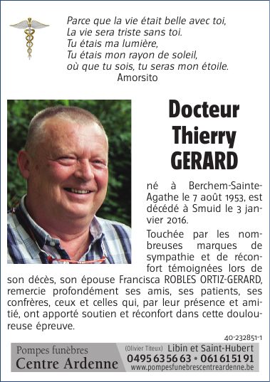 Décédé à Smuid (6890) le dimanche 3 janvier 2016 à l'âge de 62 ans