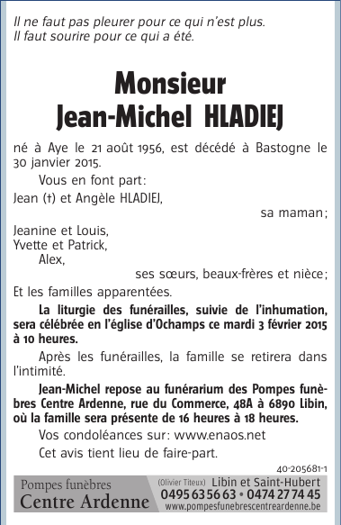 Décédé à Bastogne (6600) le vendredi 30 janvier 2015 à l'âge de 58 ans
