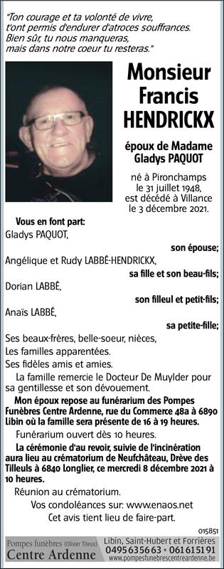 Décédé à Villance (6890) le vendredi 3 décembre 2021 à l'âge de 73 ans