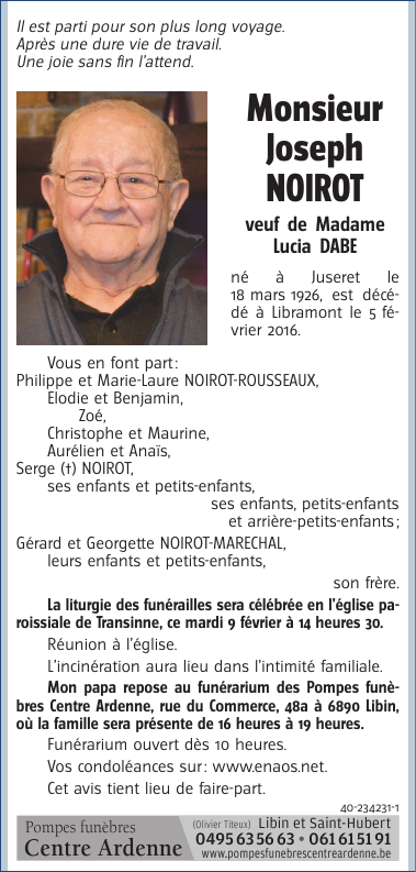 Décédé à Libramont (6800) le vendredi 5 février 2016 à l'âge de 89 ans