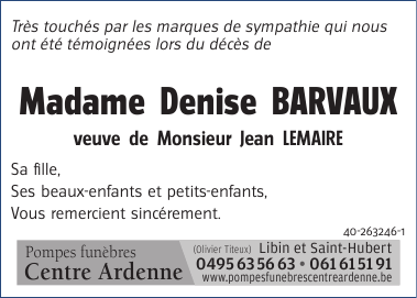 Décédée à Villance (6890) le mercredi 15 février 2017 à l'âge de 89 ans